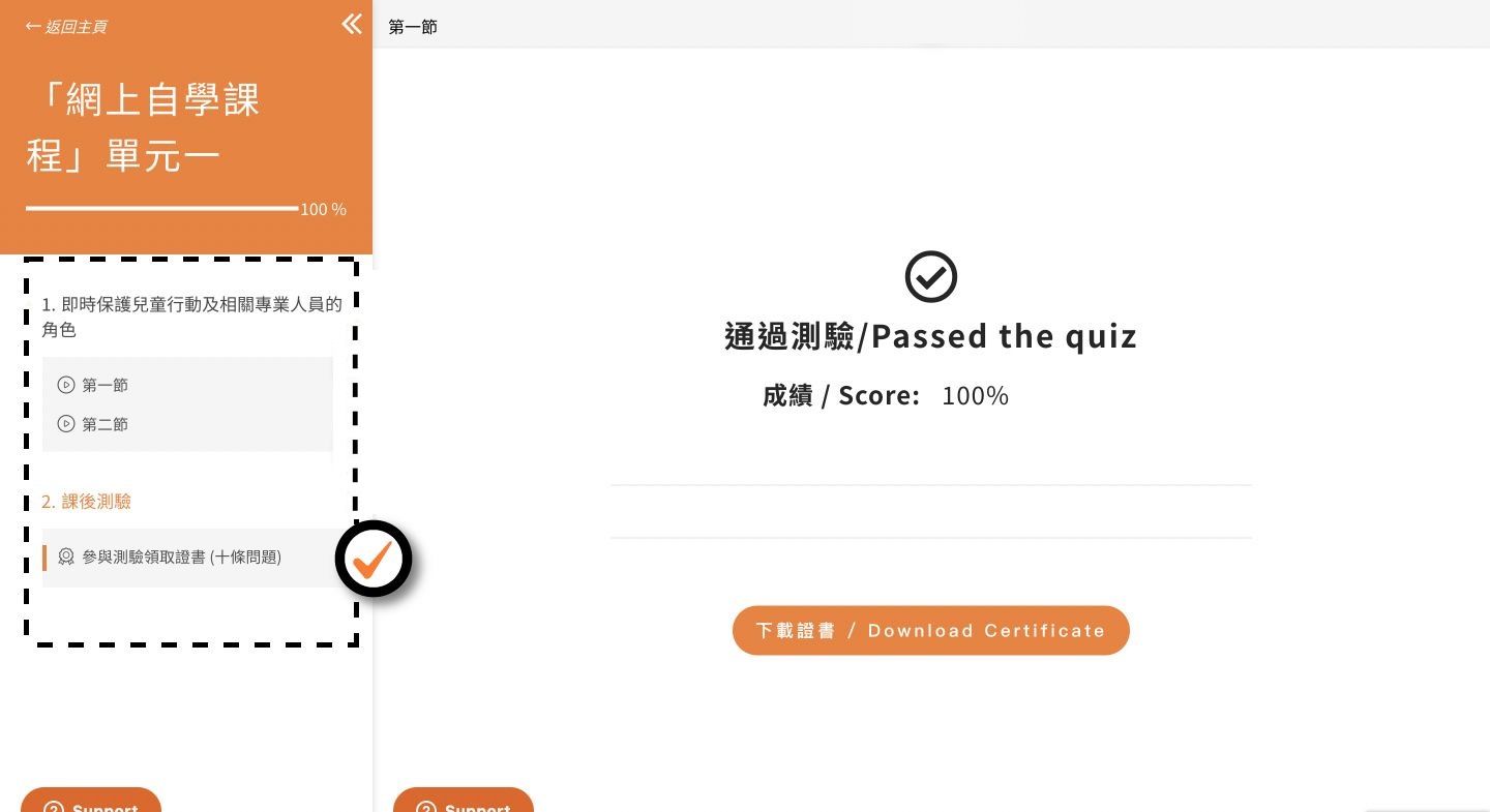 已完成課後測驗,並在測驗中得分達90%或以上,便會顯示「✓」,亦可以下載證書。