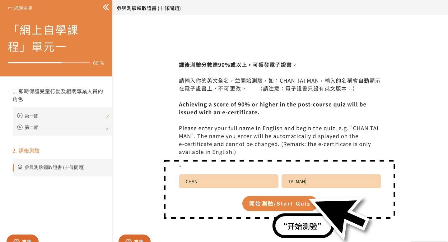已註冊的參加者完成「網上自學課程」相關單元後,可前往「課後測驗」頁面,輸入你的英文全名,再按「開始測驗」。請注意,按你輸入的英文全名將會顯示在電子證書上,不能作出更改。